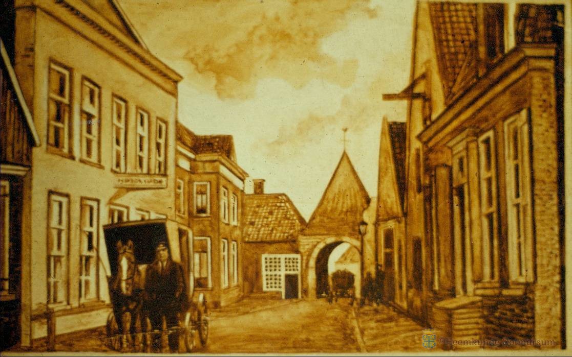 De Houtenpoort, Poelsteginckpoort of Zuiderpoort omstreeks 1870 aan de zuidzijde van de stad. De poort was een onderdeel van de verdedigingswerken van Ootmarsum. Kunstenaar onbekend.