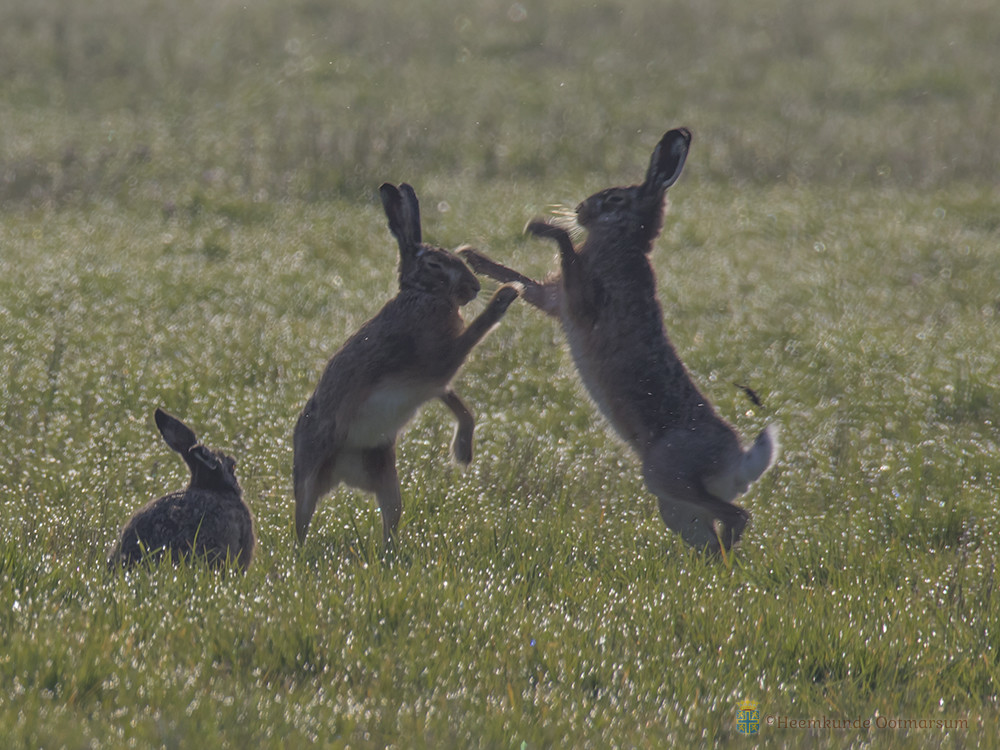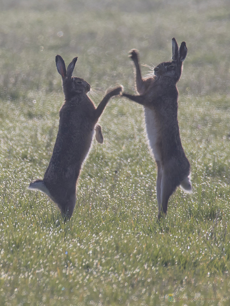 Ook de hazen zijn momenteel erg actief. De mannetjes vechten om het vrouwtje. Deze rammelaars is een lust voor het oog om naar te kijken. Mocht je een groepje hazen zien in deze periode van het jaar neem dan eens een half uurtje de tijd. Grote kans dat je dezelfde taferelen ziet als op deze foto.