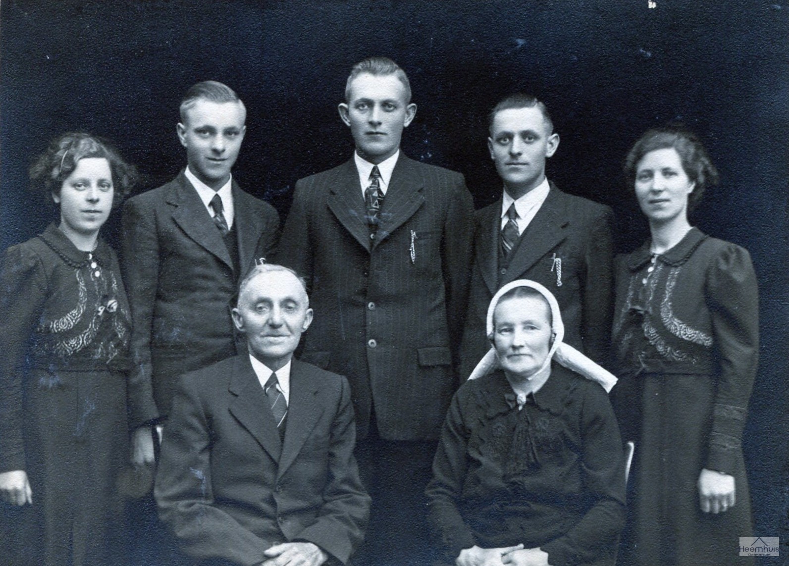 Midden van links naar rechts Gerard Stevelink (1878-1954), Johannes Hendrikus Stevelink (1845-1919), Meike Meinders (1890-1966) en Jan Stevelink (1917-1921)