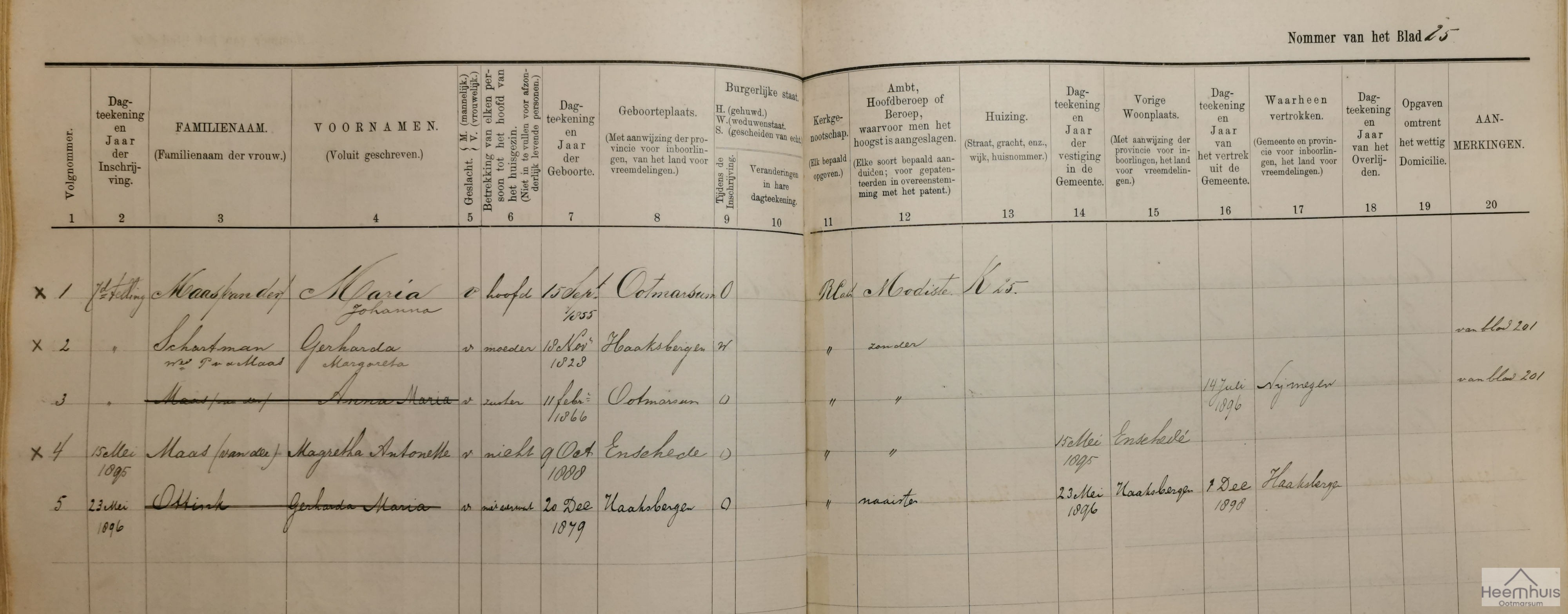 | Gerharda Maria Ottink | 20 december 1879 | Haaksbergen | v | o | niet verwant | RK | naaister | ingeschreven op 23 mei 1896 vanuit Haaksbergen vertrokken op 1 december 1898 naar Haaksbergen |