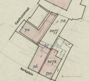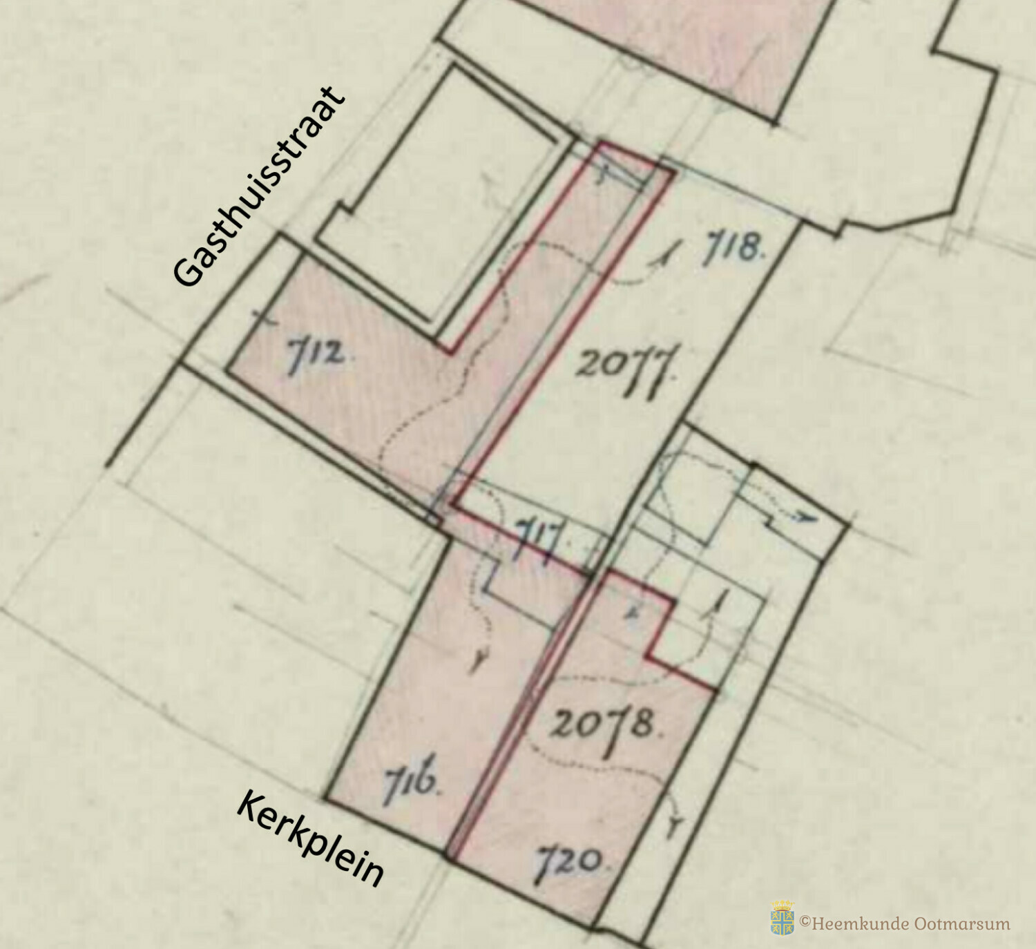 Pastorie R.K. kerk. In 1832 waren dit twee afzonderlijke percelen. Het pand links had het kadastrale nummer A716 en was eigendom van Hendrika Teusse (1785-1830) ("& mede eigenaren") en rechts het kadastrale nummer A720 en was eigendom van "erven Gerhardus Heupink (winkelier)". Toen hier in 1959 de pastorie werd gebouwd, werden de twee percelen kadastraal samengevoegd tot één perceel A3562.
