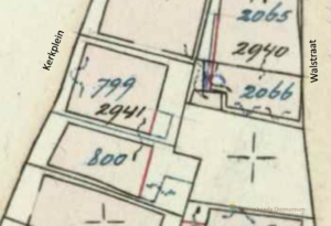 Rond 1830 lagen op deze plaats twee percelen met de toenmalige kadastrale nummers A799 (links) en A800 (rechts). In 1955 zijn deze percelen samengevoegd tot wat nu Kerkplein 12 is.