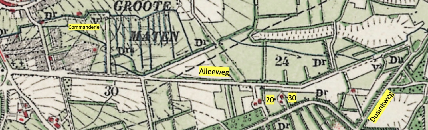 Deze boerderij lag 200 jaar geleden aan het pad (het kadaster spreekt van "bomen en weiland") dat in een rechte lijn liep langs de voormalige Commanderie en de watermolen, tot aan deze boerderij. Met een knik liep het pad door tot aan de in 1897 afgebroken boerderij Ter Duis. Het pad was verdeeld in kleine percelen, waarlangs de bouwlanden van diverse bewoners van Ootmarsum lagen. Het graspad omzoomd door de bomen zal geïnspireerd hebben tot de naam Alleeweg.