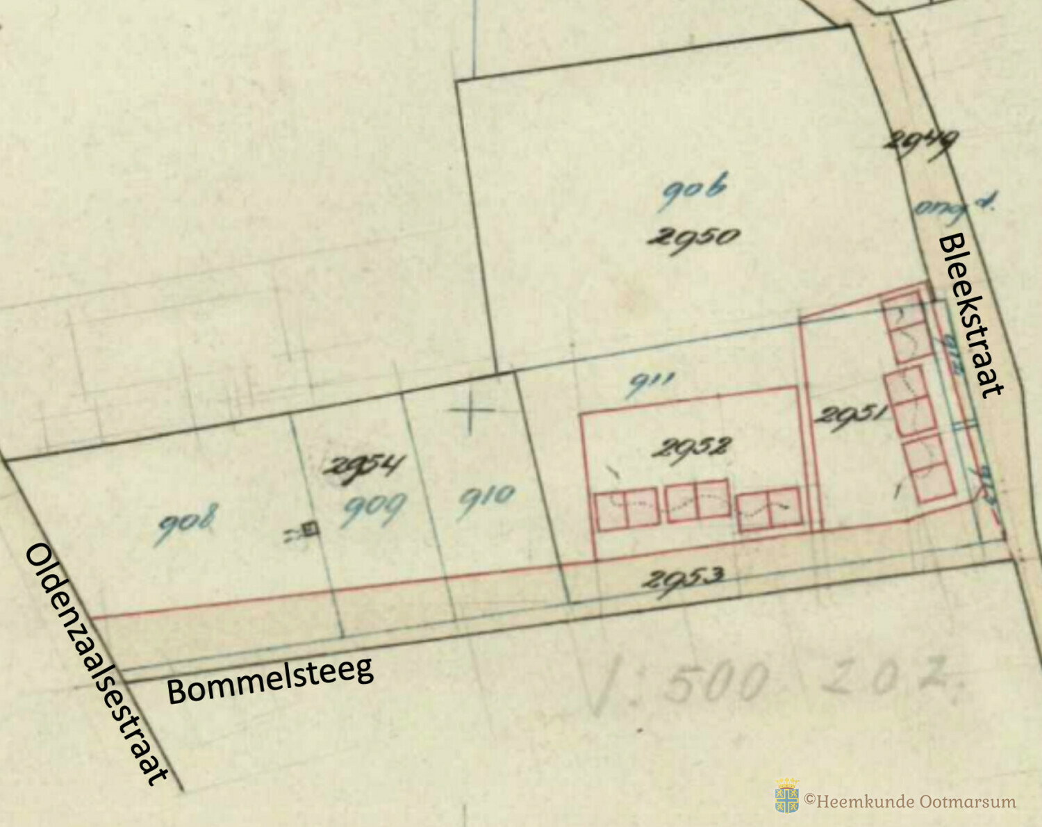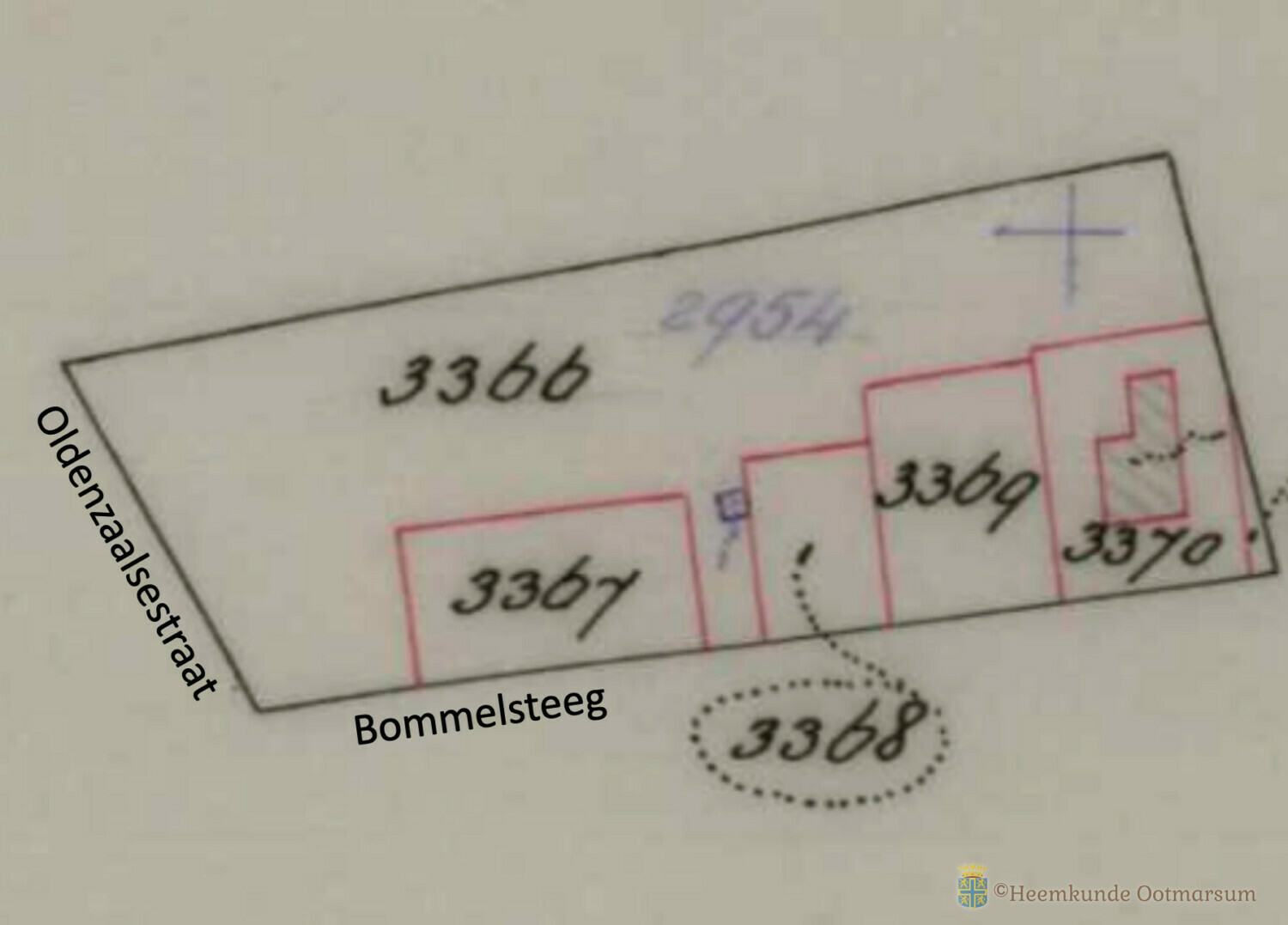 In 1955 werd de tuin samengevoegd met de achterliggende tuinen met de nummers A909 en A910 tot een perceel met een totale grootte van 3030 m2 en kreeg het nieuwe kadastrale nummer A2954.