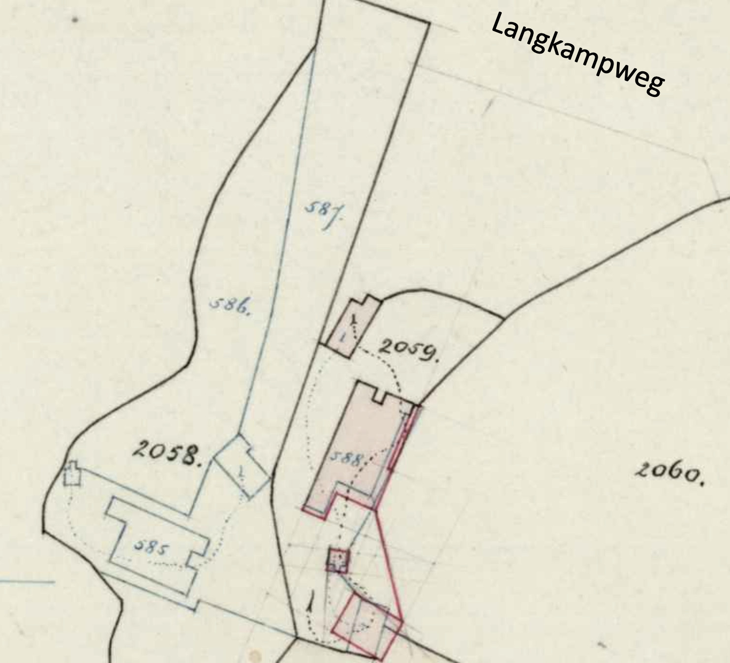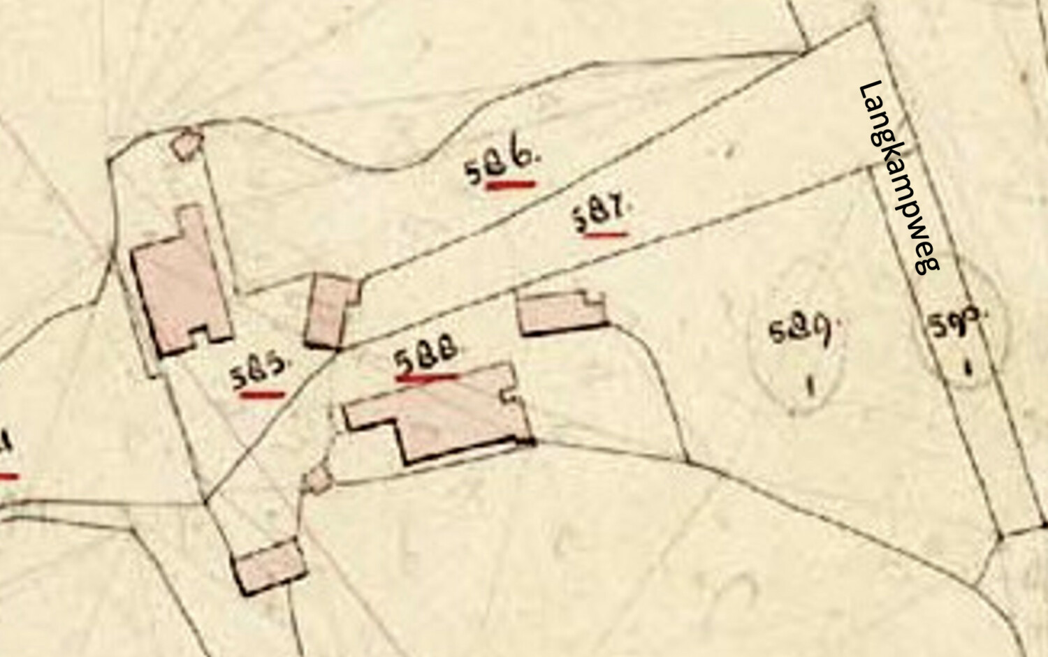2 eeuwen geleden lagen hier twee boerderijen. Gezien vanaf de Langkampweg lag links de boerderij van Joannes Henricus Lankamp (1771-1851) met het kadastrale nummer C588 en rechts de boerderij van Berend Jan Kortink (1773-1852) met het nummer C585.