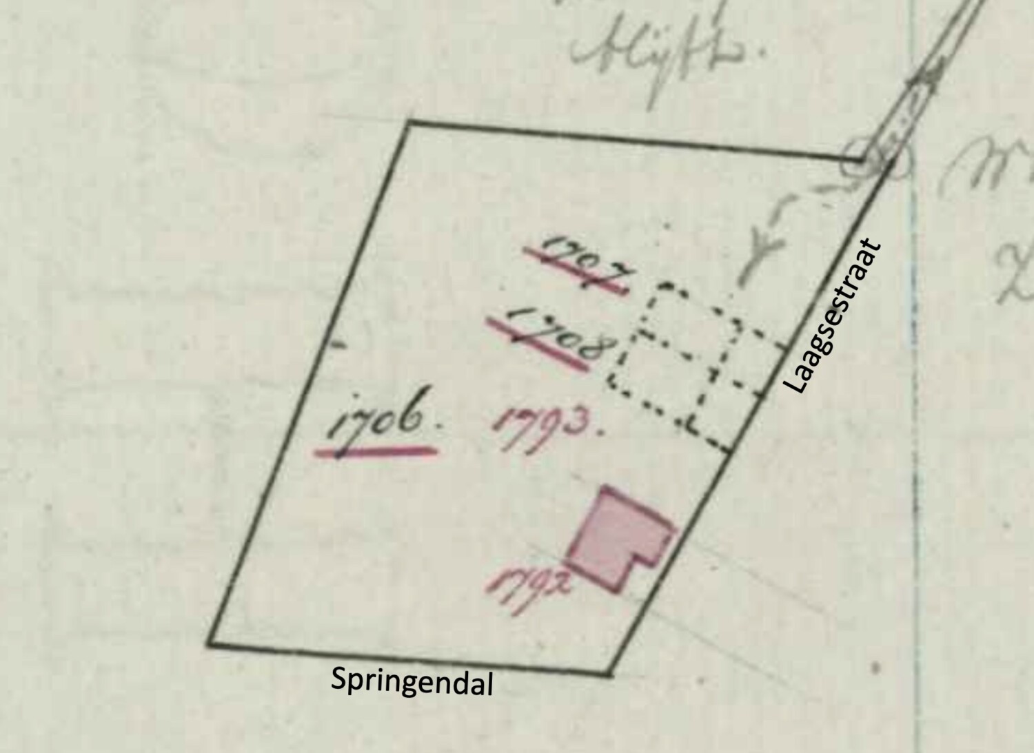 Tot 1850 was dit heide met het kadastrale nummer A16. Het was eigendom van de Markte van Ouden Ootmarsum en was 11 ha groot. In 1850 wordt er een stuk land afgesplitst, waarop een dubbel woonhuis werd gebouwd met de kadastrale nummers A1707 en A1708. Niet bekend is wie de bewoners van dit dubbele woonhuis waren.