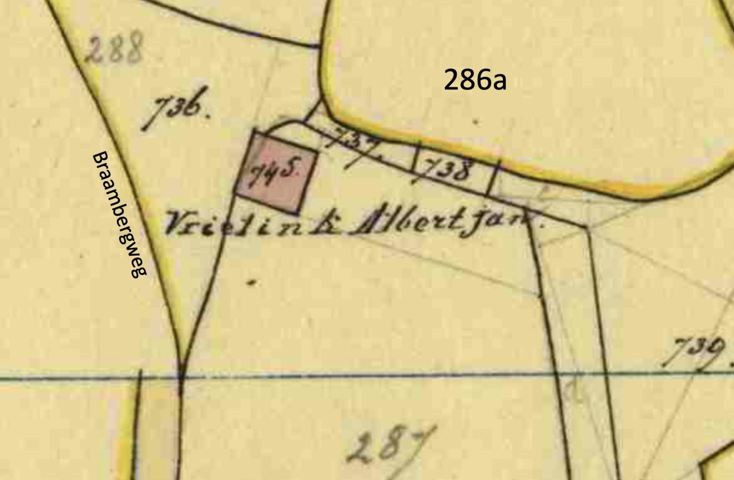 Pal hiernaast lagen twee percelen: een weiland van Bernardus Cramer D287 en bouwgrond D288 van de Marke van Hezinge. In 1861 worden de beide percelen gekocht door de erven van Gerardus Vrielink (*1764) en dat is met name zijn zoon Albert Jan Vrielink (1799-1859).