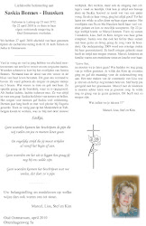 Saskia Gezina Francisca Huusken is overleden op 22 april 2010 op 37-jarige leeftijd te Oud Ootmarsum