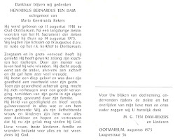 Hendrikus Bernardus ten Dam is overleden op 14 augustus 1975 op 57-jarige leeftijd te Ootmarsum