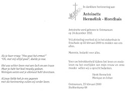 Antoinetta Eleonora Ludovica Horsthuis overleed op 22 februari 2000 op 67-jarige leeftijd te Enschede