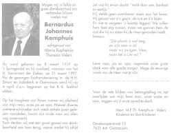 Bernardus Johannes Kamphuis overleed op 31 maart 1997 op 78-jarige leeftijd