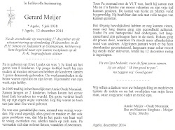 Gerardus Johannus Fransiscus Meijer is overleden op 12 december 2014 op 76-jarige leeftijd te Groot Agelo