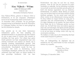 Gezina Maria Anna Wilms is overleden op 19 december 2003 op 73-jarige leeftijd te Tubbergen
