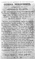 Gesina Willemsen is overleden op 6 augustus 1889 op 49-jarige leeftijd te Denekamp