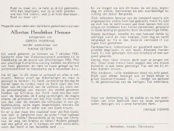 Haar weduwnaar Albartus Henderikus Hemme overleed op 1 november 1982 op 62-jarige leeftijd te Denekamp