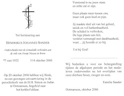 Hendrikus Johannes Sander is overleden op 14 oktober 2006 op 84-jarige leeftijd te Ootmarsum (ongehuwd)
