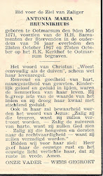 Antonia Maria Brunnikhuis is overleden op 23 oktober 1947 op 76-jarige leeftijd te Ootmarsum (ongehuwd)