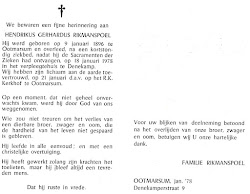 Hendrikus Gerhardus Rikmanspoel is overleden op 18 januari 1978 op 82-jarige leeftijd te Denekamp (ongehuwd)