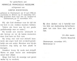 Henricus Franciscus Hesselink is overleden op 19 november 1971 op 65-jarige leeftijd te Almelo
