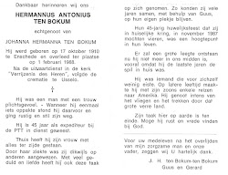 Hermannus Antonius ten Bokum overleed op 1 februari 1988 op 77-jarige leeftijd te Enschede