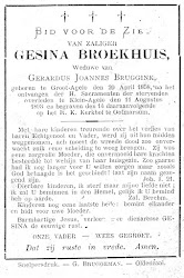 Gezina (Geziena) Broekhuis is geboren op 20 april 1858 te Groot Agelo (Denekamp) als dochter van Joannes Broekhuis (54 jaar) en Gesina Hanste (41 jaar).