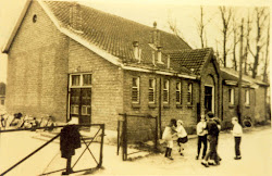 Links de houten bijbouw, waar het ingezamelde oud papier werd bewaard. Van de opbrengst werd het jaarlijkse schooluitje betaald.