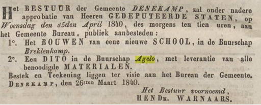 In een advertentie uit 1815 blijkt dat de buurtschool op zoek is naar een schoolmeester ’mits ten minsten den vierden rang bezittende, en daar by voldoende bewyzen kunnende overleggen van een Goed, Zedelyk en Burgerlyk gedrag’. Het schoolgeld bedraagt f 2,- per kind, uitgaande van ten minste 60 kinderen. In 1840 is er een publieke aanbesteding voor de bouw van een nieuwe school in Agelo, die in 1841 wordt opgeleverd. Het gebouw komt op hetzelfde perceel vlak aan de straat te liggen en krijgt het nummer B1289.