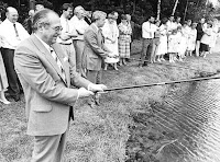 Opening van forellenkwekerij Pelly Hulsink aan de Laagsestraat. Burgemeester W. Urlings ving weliswaar de eerste vis, maar toch was het wachten op de vangst van ambtgenoot J. Norbart van de gemeente Denekamp voordat de forellenkwekerij aan de Laagsestraat officieel geopend was. De kwekerij ligt immers op Denekamps grondgebied en dus mocht Norbart het geheel openen. Om toch de nauwe band met Ootmarsum te illustreren was ook Urlings uitgenodigd.