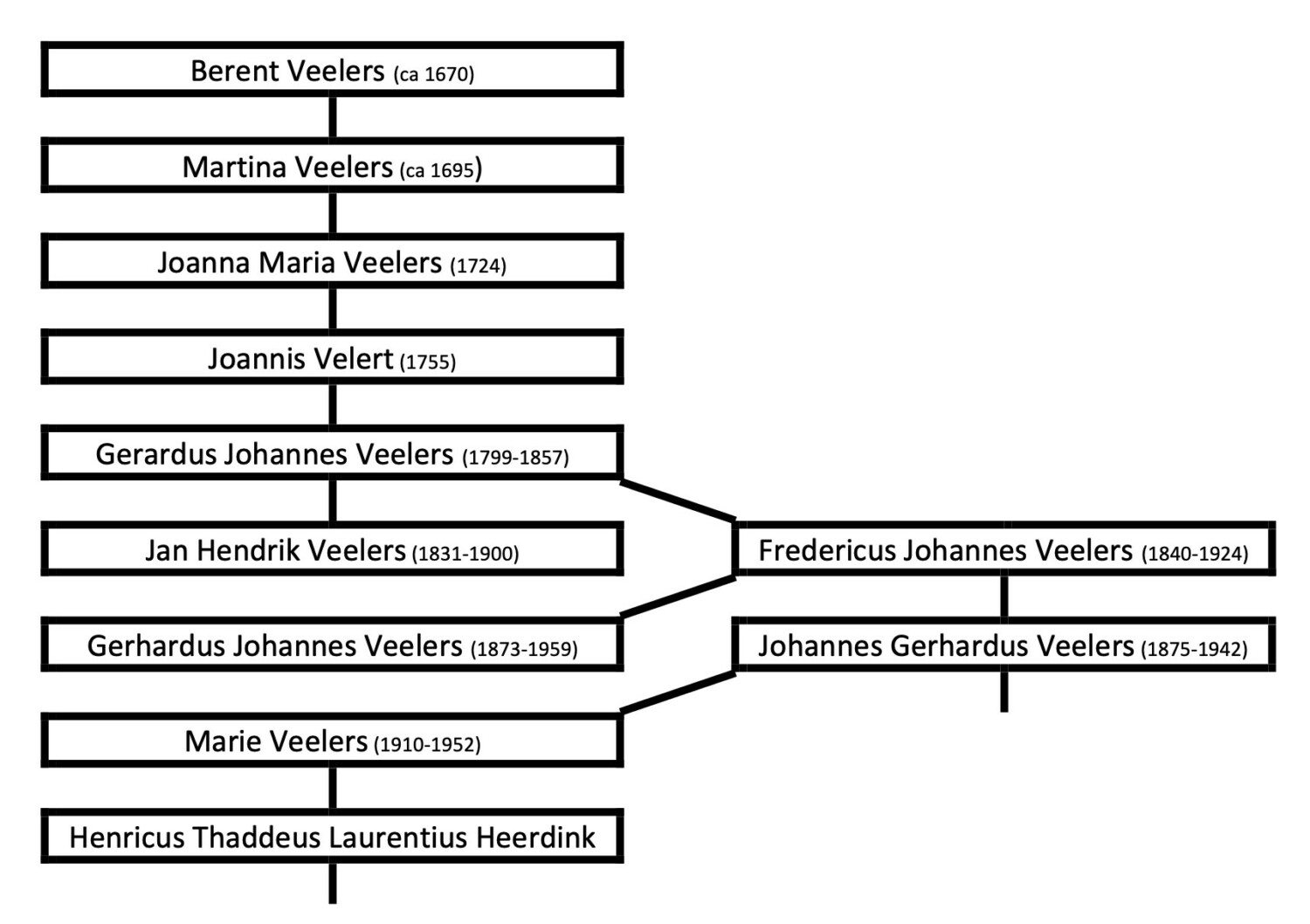 Marie Veelers trouwde in 1932 met de paardenhandelaar Hein Heerdink (1903-1984) en uit dat huwelijk werden 7 kinderen geboren, die nu wel de achternaam van vader Heerdink kregen.