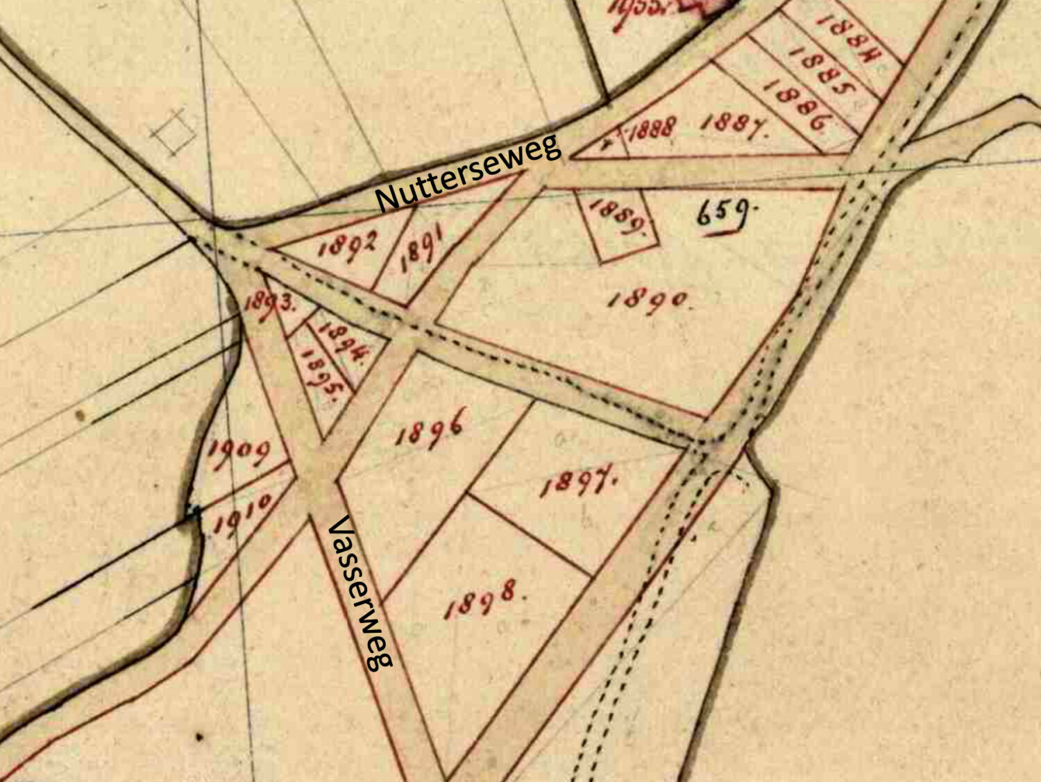 200 jaar geleden was hier alleen maar heidegrond, die in eigendom was van "De Markte van Nutter". De woning die er nu staat, lag op de grens van de grote percelen A659 en A772 die aan weerskanten van de weg naar Vasse lagen.