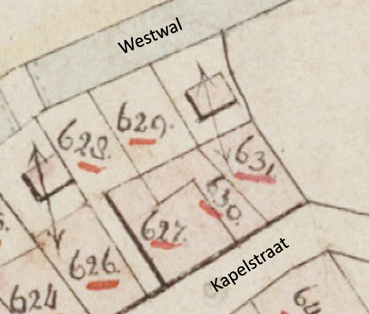 Op de plaats weer deze woning nu staat, stonden 200 jaar geleden drie geschakelde woningen. De achterkant grensde aan de Westwal, die toen nog stadsgracht was. Het waren de woningen met de kadastrale nummers A627, A630 en A631.