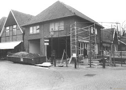 v.l.n.r.: Kapper Spaltman, Kleermaker Van Benthem, Kleding Tijhuis, Buijvoets. Rechts is een nieuwe vleugel van het bejaardenhuis in aanbouw (de oude Pastorie was gesloopt in 1974).