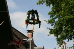 Jubileum voor sigarenmagazijn - kantoorboekhandel Brummelhuis. Jos Brummelhuis en Sylvia zijn enkele jaren geleden met hun winkel verhuisd van de Grotestraat naar de Markt. hier delen ze het pand met het VVV-kantoor Ootmarsum. Ter ere van het 40-jarig jubileum van de winkel staat er een prachtige boog in Ootmarsumse kleuren. Jos Brummelhuis staat trots voor zijn zaak.