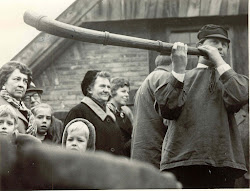 V.l.n.r. Frans Velthuis (1936-2016), Frans Tenniglo (1934-2007), alleen hoedje zichtbaar van Poaskearl Jan Bloemen (1932-2003), Jan Weustink (1936-2023), in de deuropening Gait Veldboer (1929-2000) (metselaar)