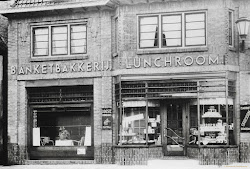 In de deuropening staat mevr. Lide Buijvoets (grote tante Lide), links kruidenierswinkel Bank.