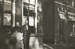 In de deuropening staat mevr. Lide Buijvoets (grote tante Lide), links kruidenierswinkel Bank.