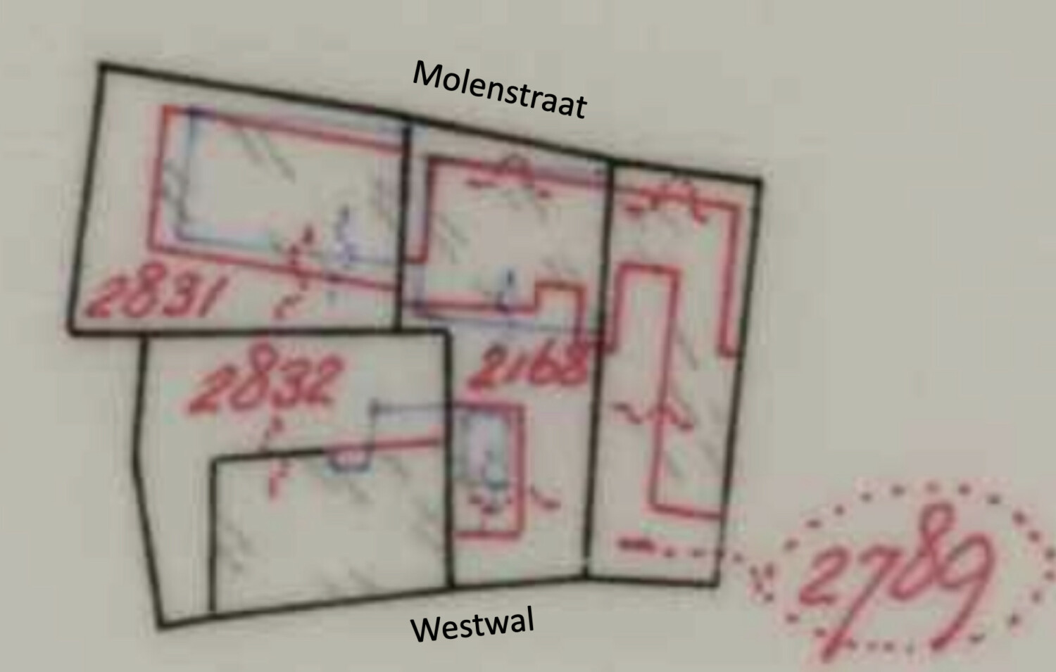 Het huis van schilder Weustink aan de Molenstraat had een achteruitgang aan de Westwal. De familie Frowijn bewoonde de achterhelft van het huis, dus aan de Westwalzijde. Rechts is het gesloopte pand te zien waar Ben Holsink zijn nieuwe kapsalon zou gaan realiseren.