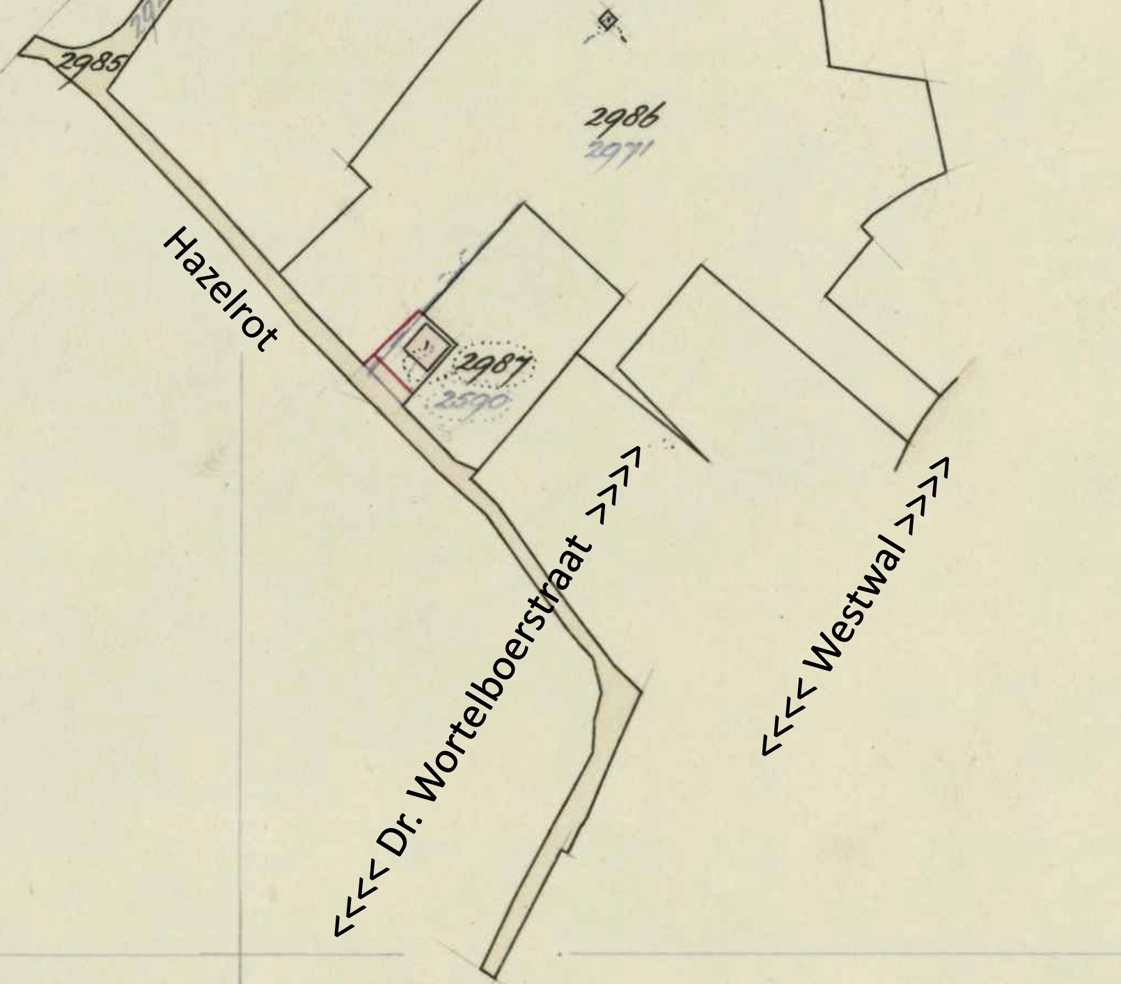 Het perceel grensde links aan het Hazelrot, dat tot die tijd achter de woningen van wat daarna de Wortelboerstraat zou zijn liep en eindigde waar nu Wortelboerstraat 19 is. In 1960 werd ook de bocht in deze weg betrokken bij de woning en kreeg een apart kadastraal nummer: A3096. In 1974 werden beide percelen samengevoegd tot het nieuwe nummer B257. De steeg die achter de woningen loopt, is dus oorspronkelijk Hazelrot geweest.