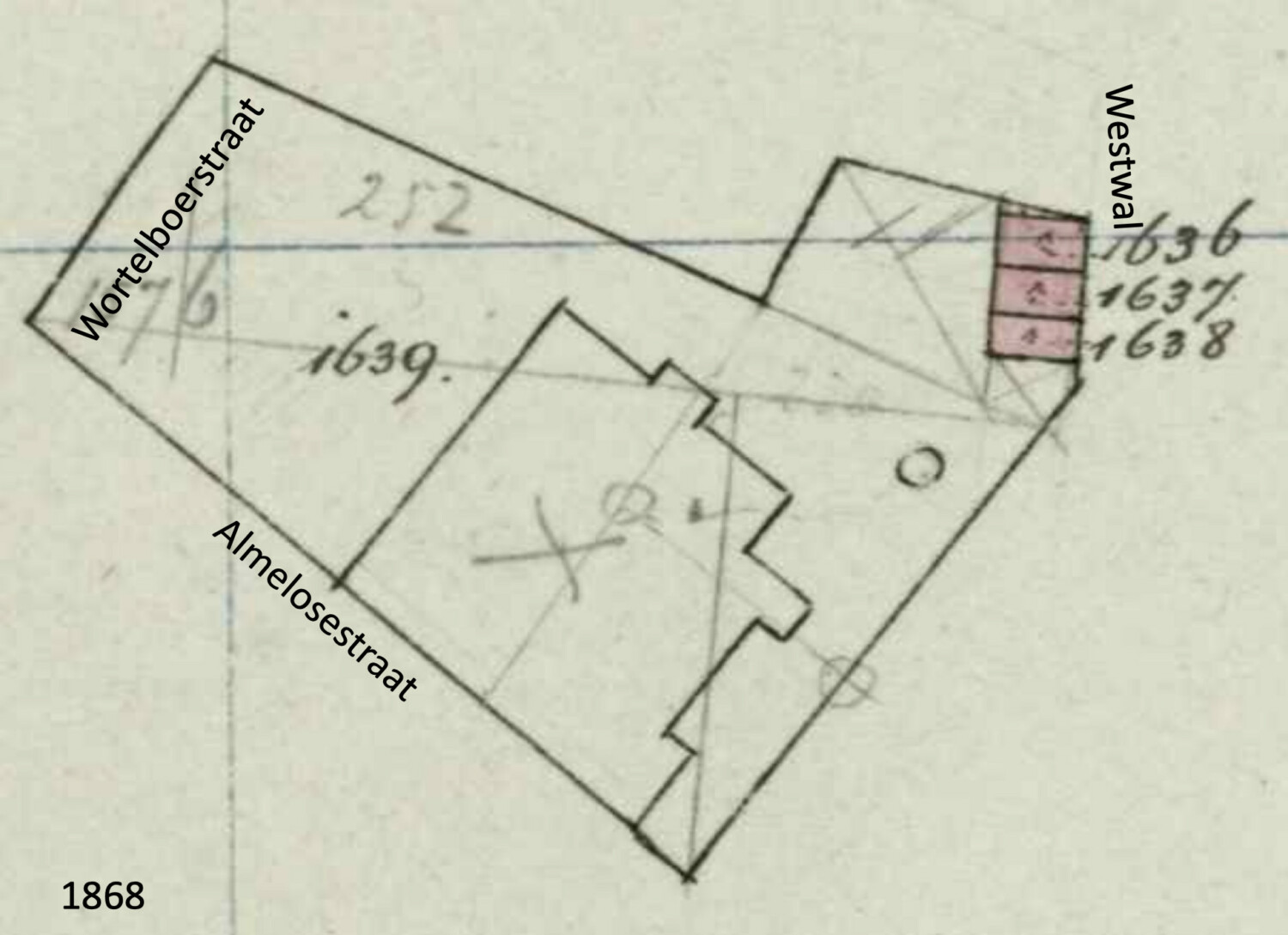 In 1868 worden drie percelen afgesplitst van A1576, waarop drie woningen worden gebouwd. Het zijn de percelen A1636, A1637 en A1638. Deze drie woningen stonden op de plaats waar nu de huisnummers 3 en 5 staan. Het resterende weiland met stoomweverij kreeg daarmee het nieuwe nummer A1639.