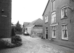 De schuren van Bruggink en Heisterkamp zijn herbouwd tot klokkenwinkel "De Oude Tijd" en binnenplaats Heisterkamp (midden). Rechts woning Heisterkamp. Links café Marieke en "Riet Schulten.
