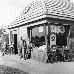 Fietsenmaker Jan Beld (1897-1970) met zijn zoon Jan Beld (1939-2015) voor zijn werkplaats aan de Denekamperstraat. Jan Beld had zijn winkel werkplaats links naast Reuwer aan de Denekamperstraat; hij pachtte de grond van Weustink “De Rozenstruik”. Voor zijn trouwen in 1938 sliep hij boven de werkplaats. Na zijn huwelijk kocht hij pand Rolink Marktstraat 7 en 9. Hij had een fietsenzaak aan de Marktstraat 7; zijn vrouw had de kruideniers/sigarenwinkel ernaast in pand Marktstraat 9.