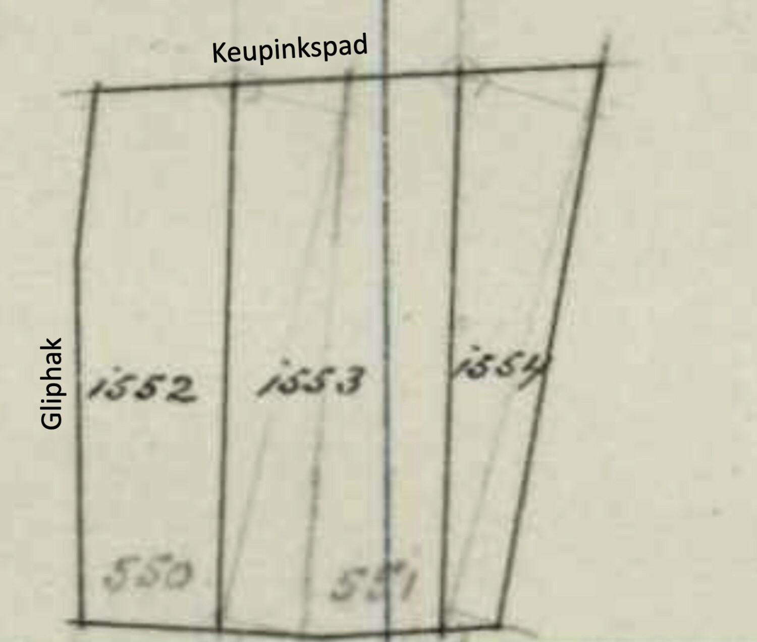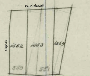 In 1864 werden de percelen tussen Berend Jan en zijn zoon Johannes Franciscus Morshuis (1826-1897) verdeeld. Berend Jan behield een deel met het nummer A1552 ter grootte van 600 m2 en zijn zoon kreeg het grootste gedeelte met de kadastrale nummers A1553 en A1554.