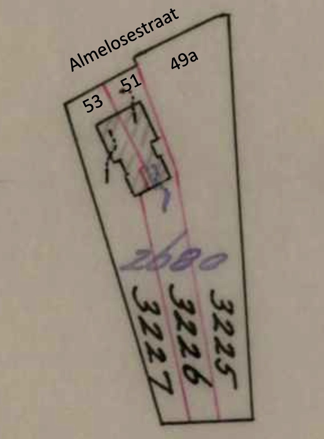 In 1961 wordt de dubbele woning gesplitst in drie percelen. De percelen A3225, A3226 en A3227 worden respectievelijk de huisnummers 49a, 51 en 53.