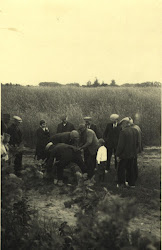 vlnr toeschouwers onbekend, boeren: ?, Bernard Brookhuis (Timmusboer), ? , Jan Stevelink (Wiegert), Gerard Luttikhuis (Holtwijk), ? , voor links naast het jongetje Luttikhuis Ootmarsum (broodhaler “Knikbeen”)